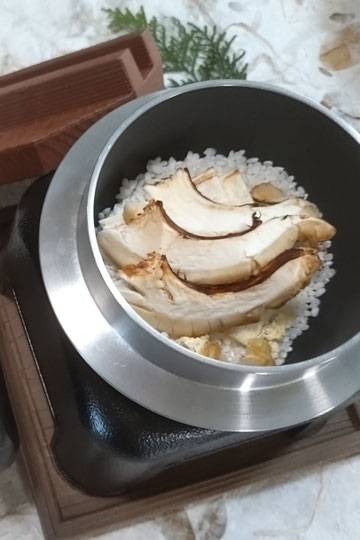 *香りを楽しむ松茸ご飯は開いた松茸を使います。松茸は開いていたほうが香りがよいのです。「本物の香りを味わってほしい..」という店主古川のこだわりです。